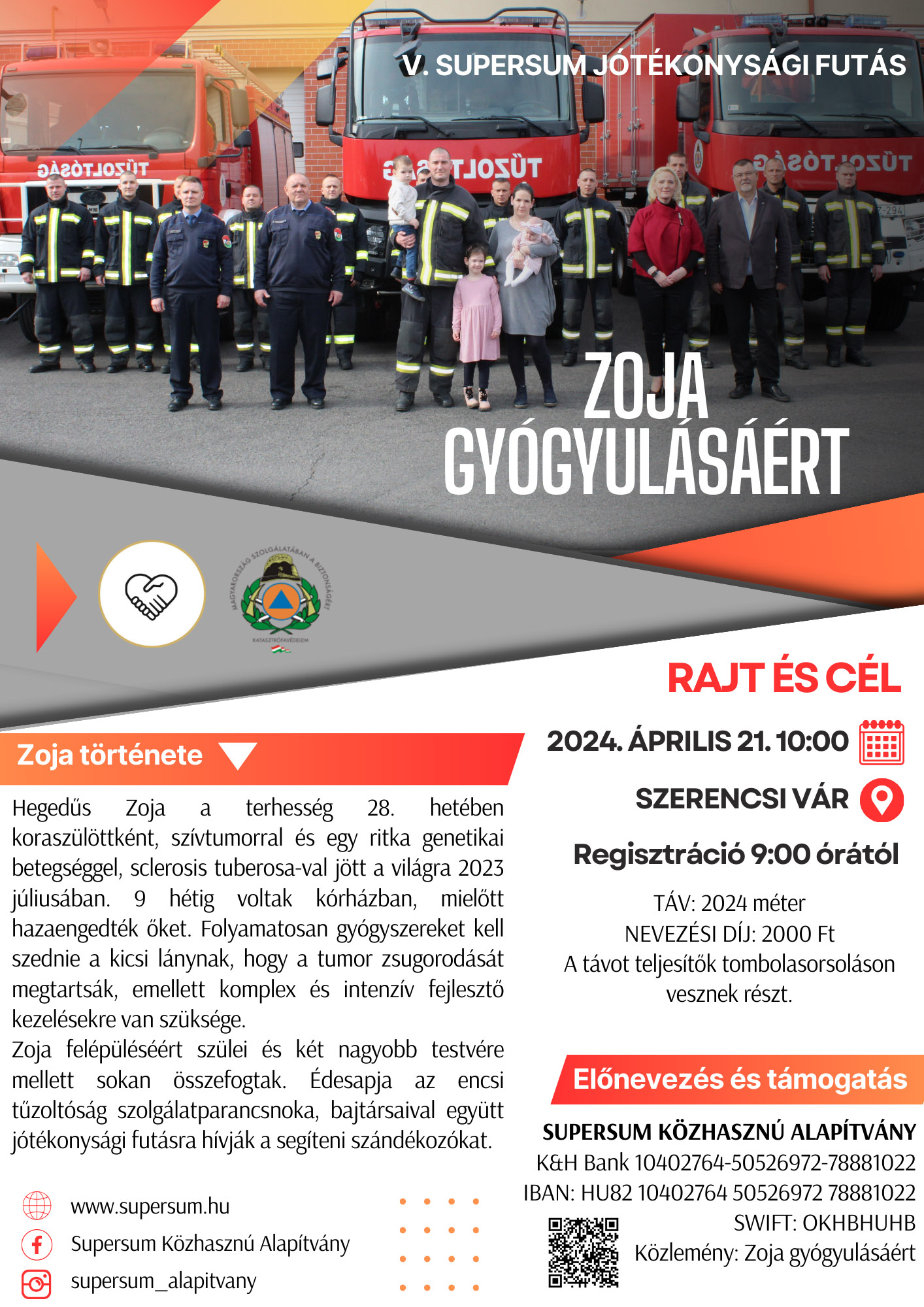 Az encsi tűzoltóság szolgálatparancsnoka, Hegedűs István kislánya, Zoja, a terhesség 28. hetében koraszülöttként, szívtumorral és egy ritka genetikai betegséggel, sclerosis tuberosa-val jött a világra 2023 júliusában. 9 hétig voltak kórházban, mielőtt hazaengedték őket. Folyamatosan gyógyszereket kell szednie a kicsi lánynak, hogy a tumor zsugorodását megtartsák, emellett komplex és intenzív fejlesztő kezelésekre van szüksége. Szülei minden lehetőséget megragadnak, hogy Zoja állapota javuljon, szeretnének eljutni a solymári Borsóházba, illetve egy budapesti speciális intézménybe, ahol rengeteg gyermeken segítettek már.