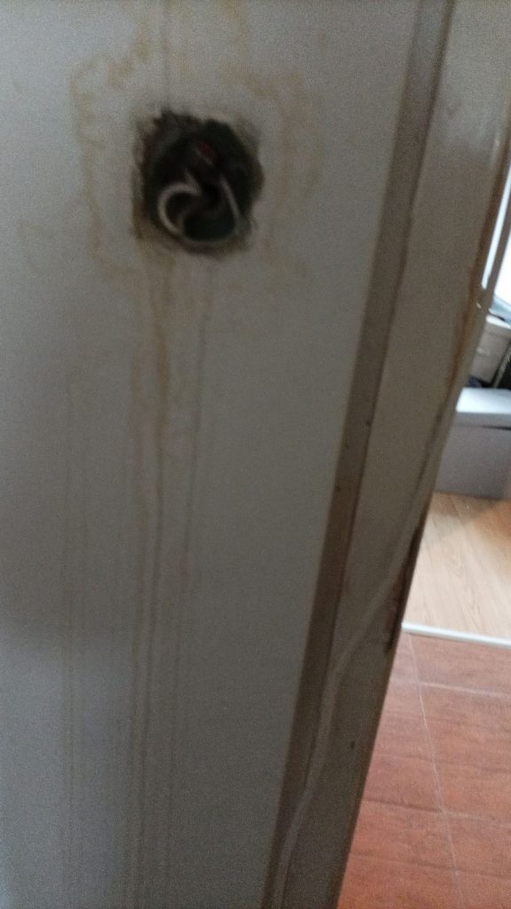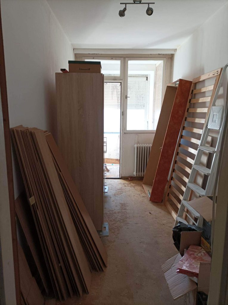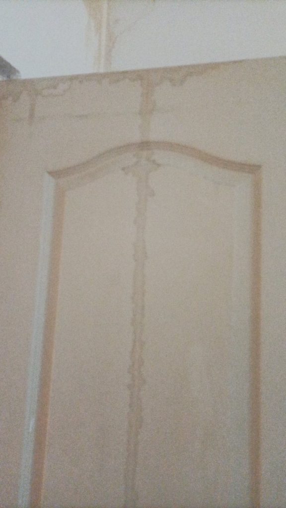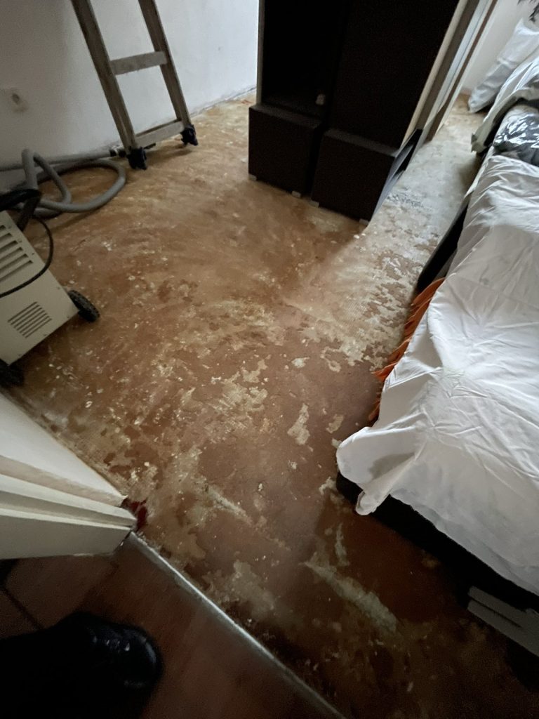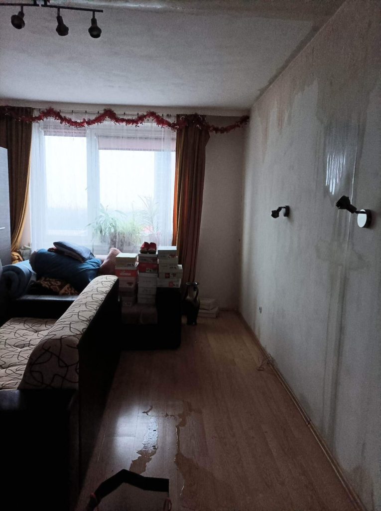 minden elázott, a falakon, a plafonon folyik a víz, a konnektorokból és villanykapcsolókból úgyszintén, a padló felázott, amit a padlószőnyeggel együtt betonig fel kellett szedni, a bútorok szétáztak, dohosak. Egy testvérpár él a lakásban, a hölgy egészségügyi dolgozóként épp műszakban volt szilveszter éjszaka, beteg testvére volt csak otthon, mikor tűz ütött ki felettük, de szerencsére nem esett baja.