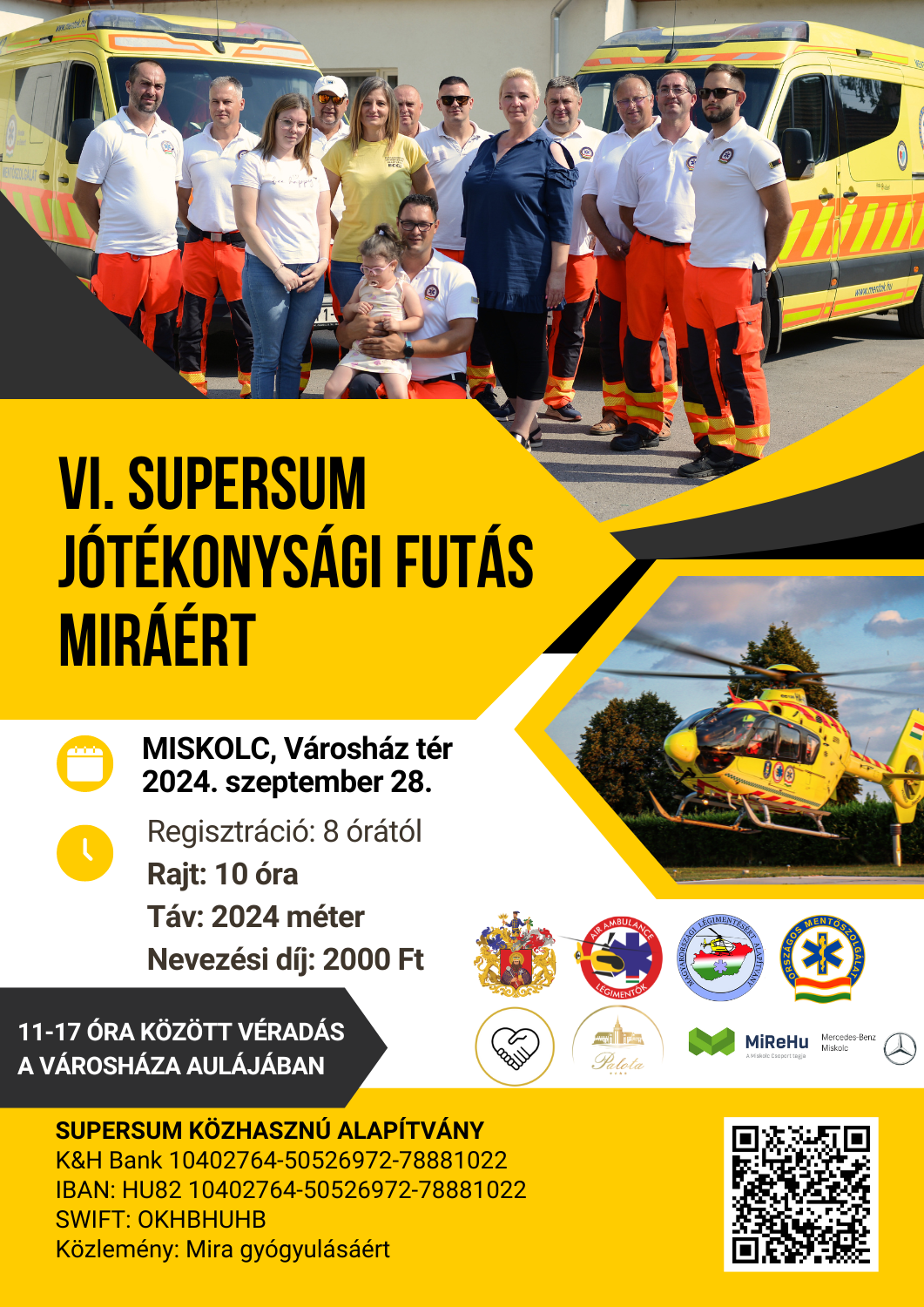 Idén immár 6. alkalommal szervezzük a Supersum jótékonysági futásunkat, és másodjára közösen a Magyarországi Légimentésért Alapítvánnyal. A tavalyi év Miskolcon nem a megszokott forgatókönyv szerint zajlott, első hallásra problémának látszott, majd két alapítvány közötti együttműködést hozta meg. Egyszerre, egy időben futás és véradás, két nemes ügy, két agilis alapítványt mozgató nő, akik nem ismertek lehetetlent. ÉS megvalósult! A Supersum Alapítvány rendezvénye és a Magyarországi Légimentésért Alapítvány és Magyar Légimentő Nonprofit Kft. rendezvénye összekapcsolódott és működött. Ez évben így már nem volt kérdés, hogy a két szervezet ismét együtt szervez, sőt, mint bajtársi közösség csatlakozott a 4 éves Mira gyógyulásáért szervezett jótékonysági futáshoz. A Miskolci bázison dolgozók ismerik Kovács Gábor mentőst, akinek kislányának segítségre van szüksége.